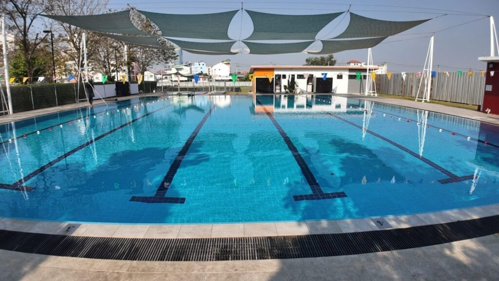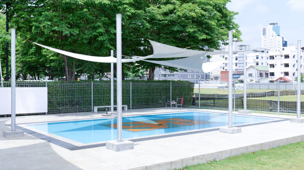 • The swimming pool measures 25 x 18 meters and has shading for sun protection.