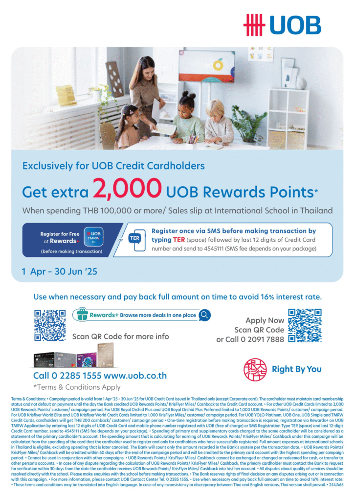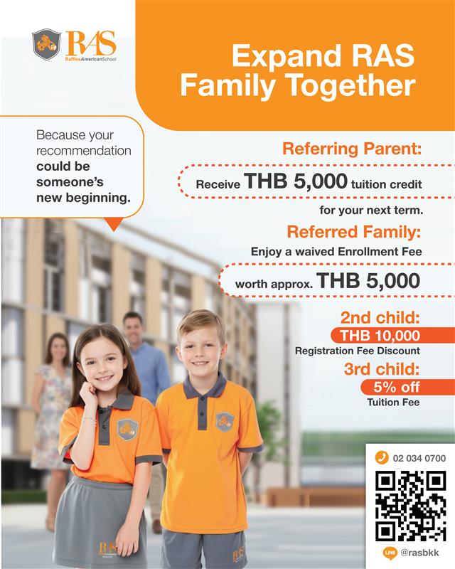 When your referral successfully enrolls, you’ll receive a THB 5,000 tuition credit, and your friend’s family will enjoy a waived enrollment fee (valued at THB 5,000).
