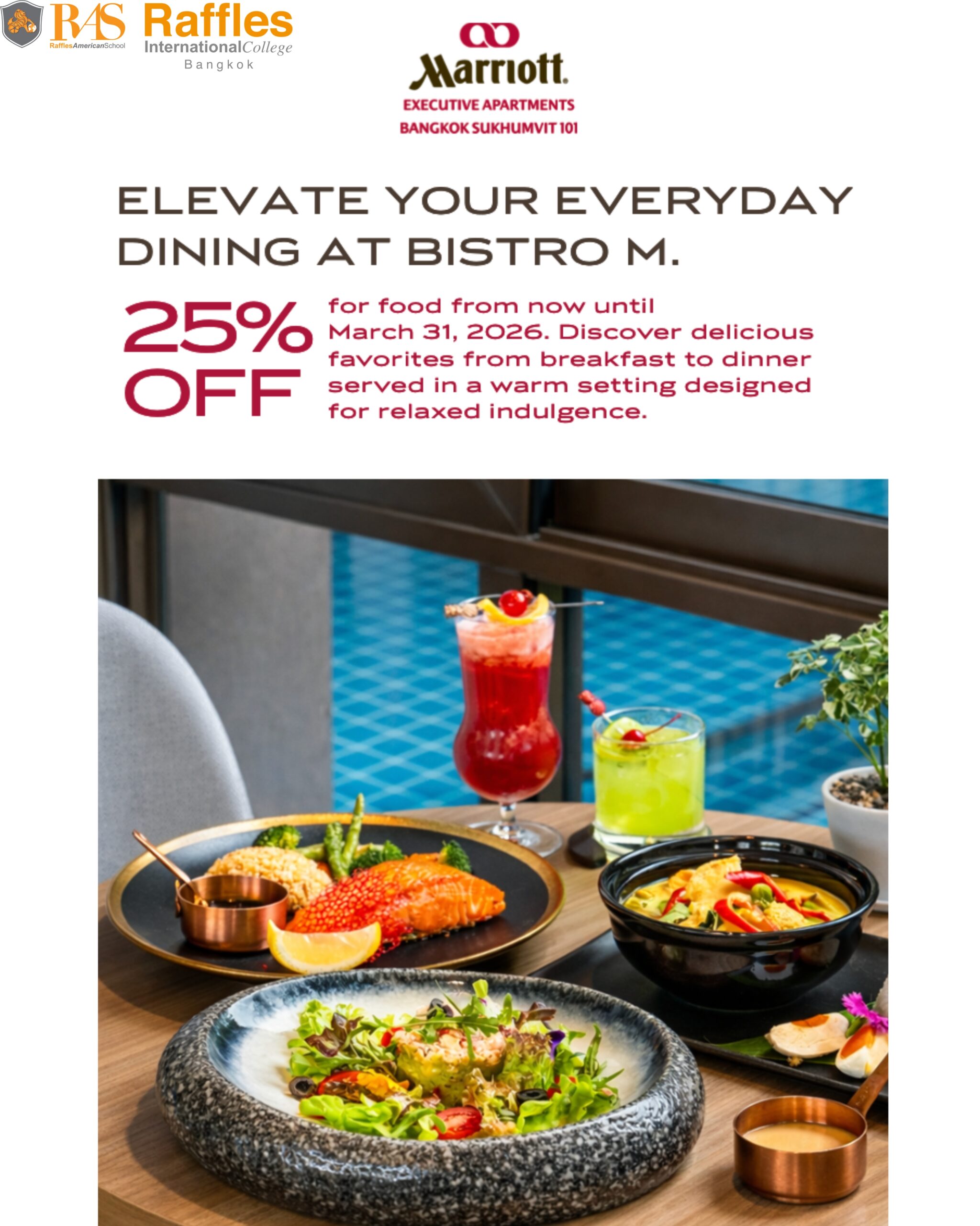 * Guests may inform the restaurant that they are from Raffles American School and present the voucher to the restaurant staff. The voucher can be obtained.